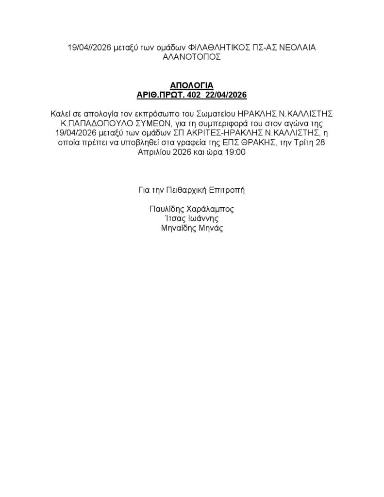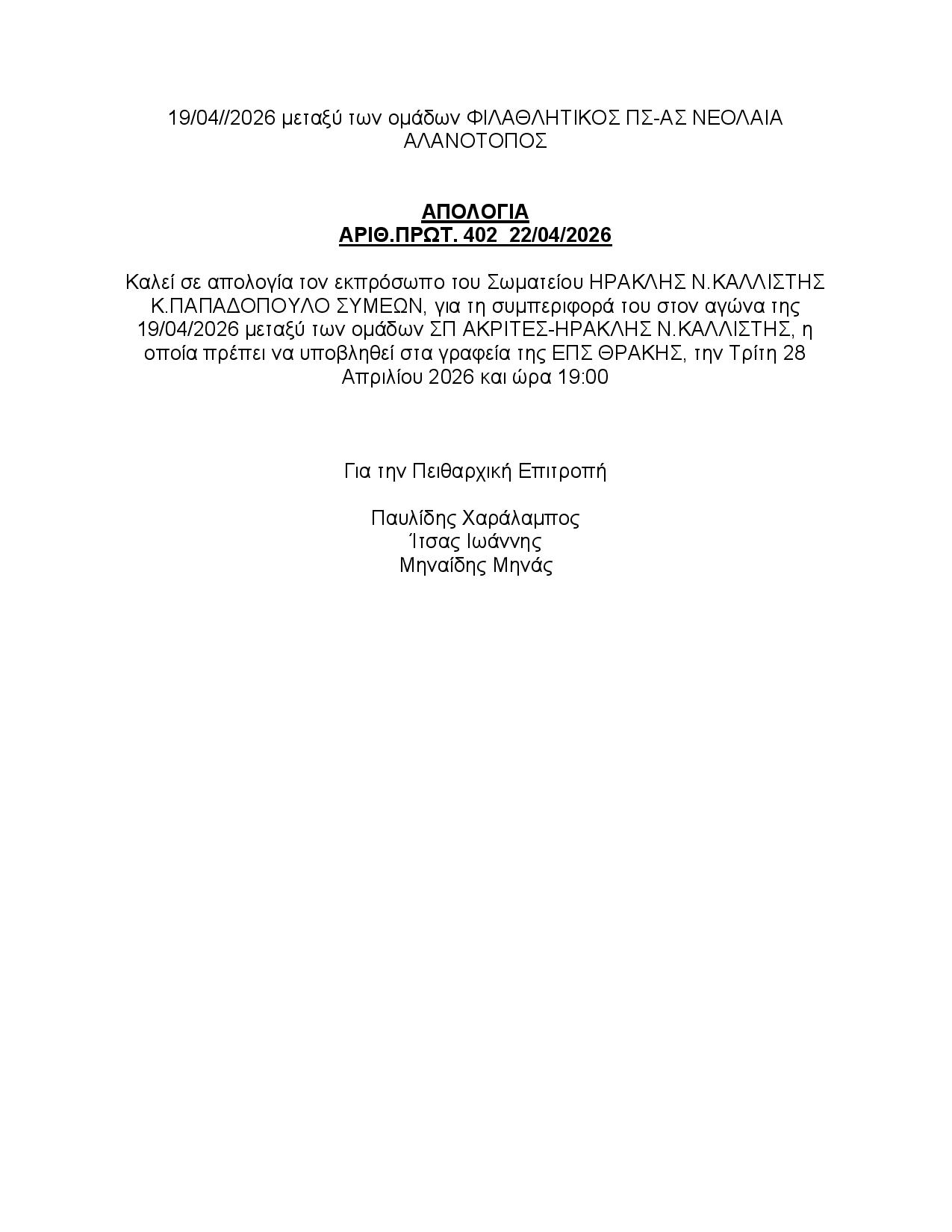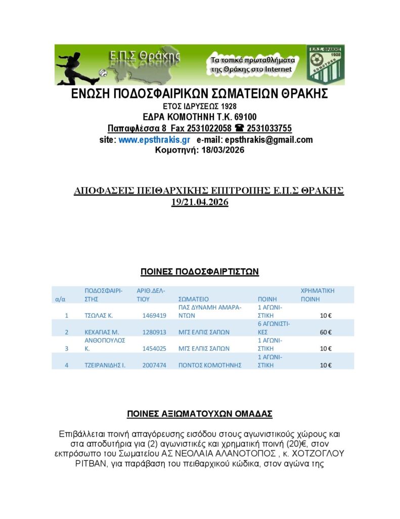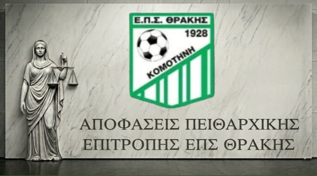 ΠΟΙΝΕΣ ΑΠΟΦΑΣΕΙΣ ΠΕΙΘΑΡΧΙΚΗΣ ΕΠΙΤΡΟΠΗΣ Ε.Π.Σ ΘΡΑΚΗΣ 19/21.04.2026 admin 22/04/2026 Continue Reading Previous: ΟΡΙΣΜΟΙ ΔΙΑΙΤΗΤΩΝ 5ης ΑΓΩΝΙΣΤΙΚΗΣ PLAY OFF KAI 3ης ΑΓΩΝΙΣΤΙΚΗΣ PLAY OUT Α ΚΑΤΗΓΟΡΙΑΣNext: ΑΠΟΤΕΛΕΣΜΑΤΑ 5ης ΑΓΩΝΙΣΤΙΚΗΣ PLAY OFF Α ΚΑΤΗΓΟΡΙΑΣ Related Stories ΠΟΙΝΕΣ ΑΠΟΦΑΣΕΙΣ ΠΕΙΘΑΡΧΙΚΗΣ ΕΠΙΤΡΟΠΗΣ Ε.Π.Σ ΘΡΑΚΗΣ 07.04.2026 admin 09/04/2026 ΠΟΙΝΕΣ ΑΠΟΦΑΣΕΙΣ ΠΕΙΘΑΡΧΙΚΗΣ ΕΠΙΤΡΟΠΗΣ Ε.Π.Σ ΘΡΑΚΗΣ 04-05/04/2026 admin 08/04/2026 ΠΟΙΝΕΣ ΑΠΟΦΑΣΕΙΣ ΠΕΙΘΑΡΧΙΚΗΣ ΕΠΙΤΡΟΠΗΣ Ε.Π.Σ ΘΡΑΚΗΣ 31.03.2026 admin 01/04/2026